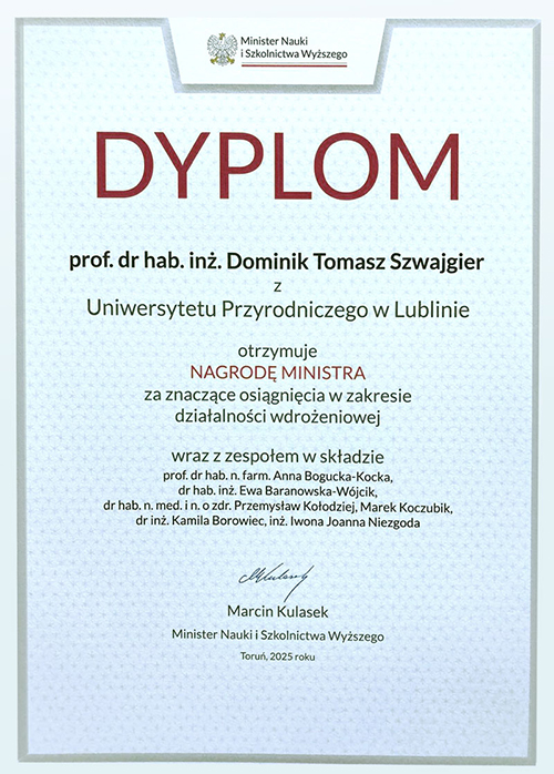 We are one of 6 teams awarded by the Minister of Science and Higher Education, Mr. Marcin Kulasek, for significant achievements in the field of implementation activities. The award was granted during the Polish Science Gala, organized on 19.02.25. I would like to thank my colleagues: Dr. hab. Ewa Baranowska-Wójcik, MSc. Eng. Iwona Niezgoda and Dr. Eng. Kamila Borowiec from my University, as well as Prof. dr. hab. Anna Bogucka-Kocka and dr. hab. Przemysław Kołodziej from the Medical University of Lublin for fruitful scientific cooperation within the Tango project.