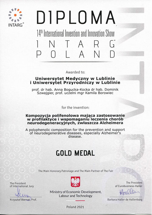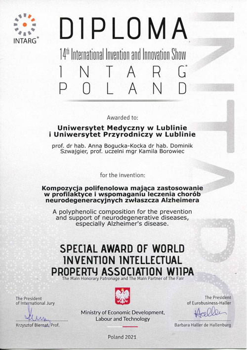 za wynalazek "Kompozycja polifenolowa mająca zastosowanie w profilaktyce chorób neurodegeneracyjnych"