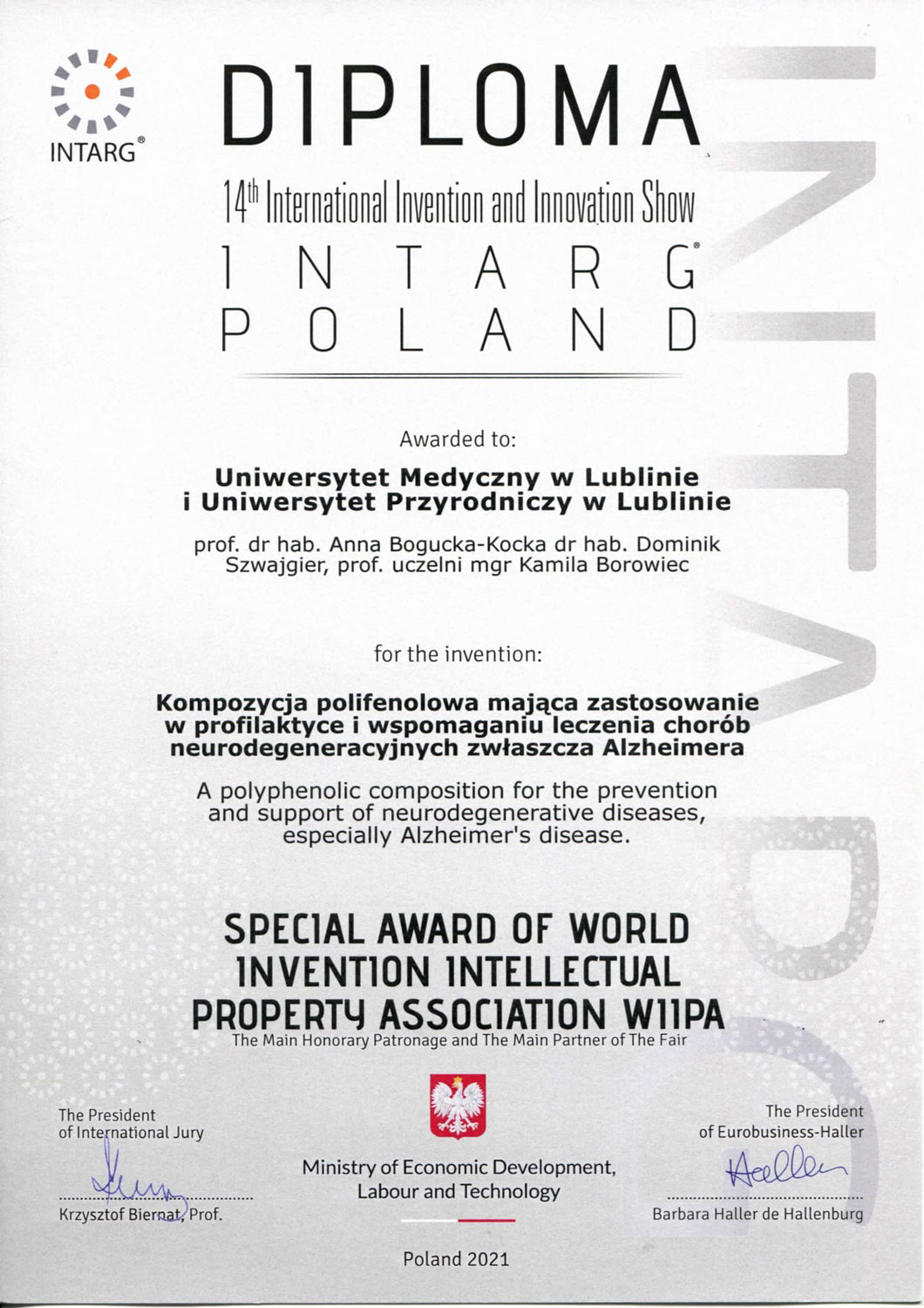 Nagroda specjalna World Invention Intellectual Property Association WIIPA, 2021